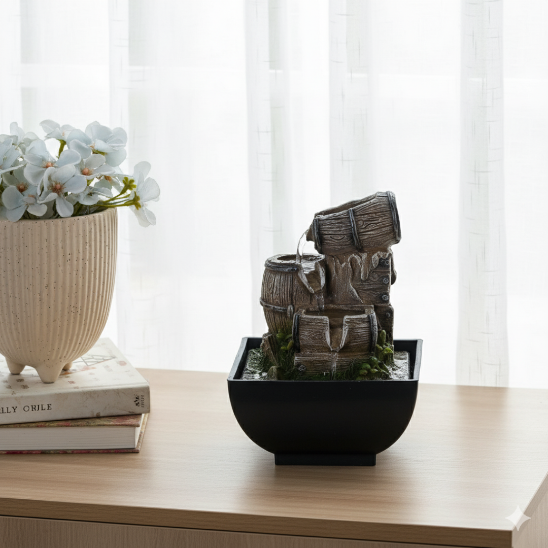 Bring the calming essence of nature into your space with The Wooden Spill Table Fountain — a beautifully crafted piece that evokes the rustic tranquility of a mountain stream. Designed to resemble weathered wooden barrels gently overflowing with crystal-clear water, this tabletop fountain is the perfect blend of natural charm and modern relaxation.