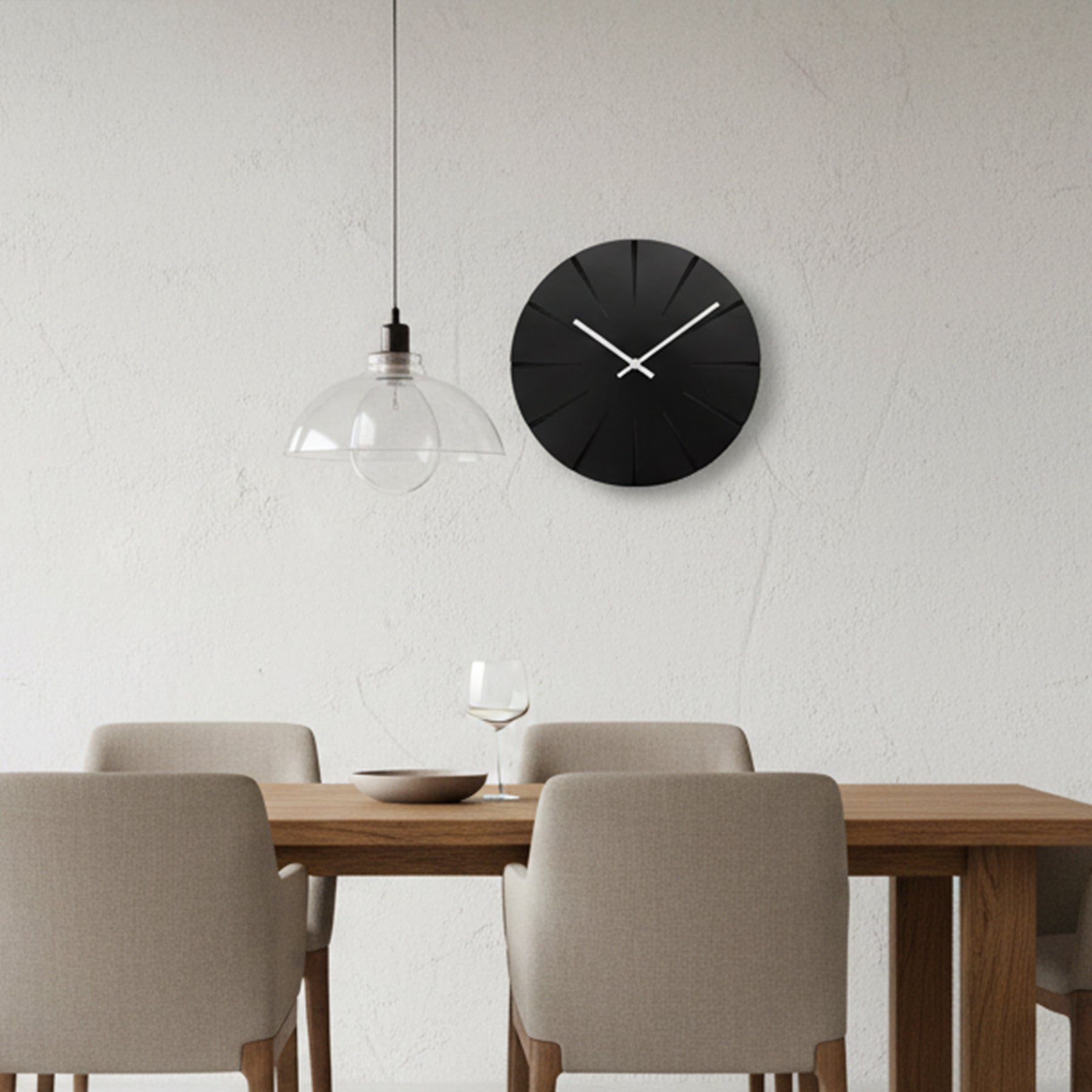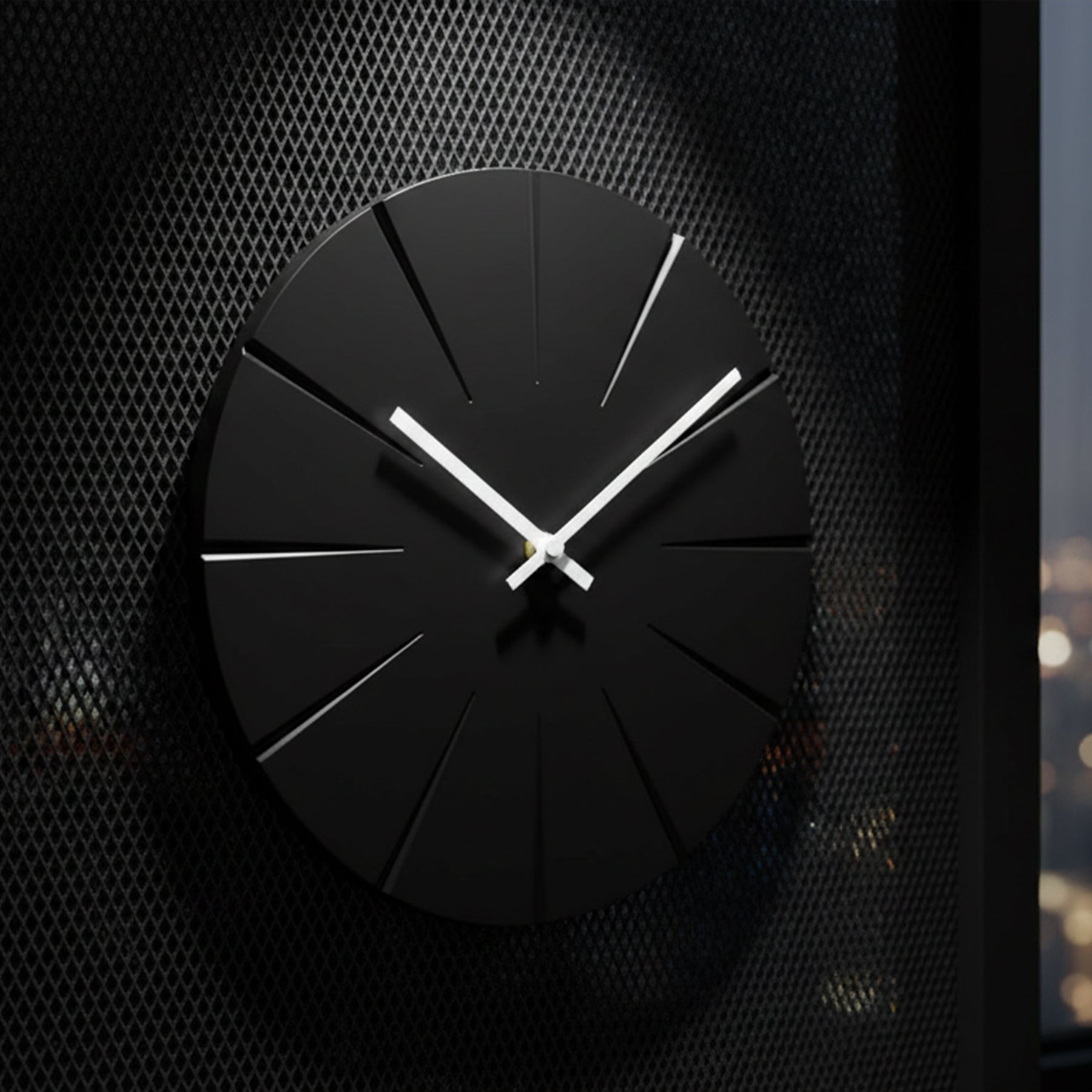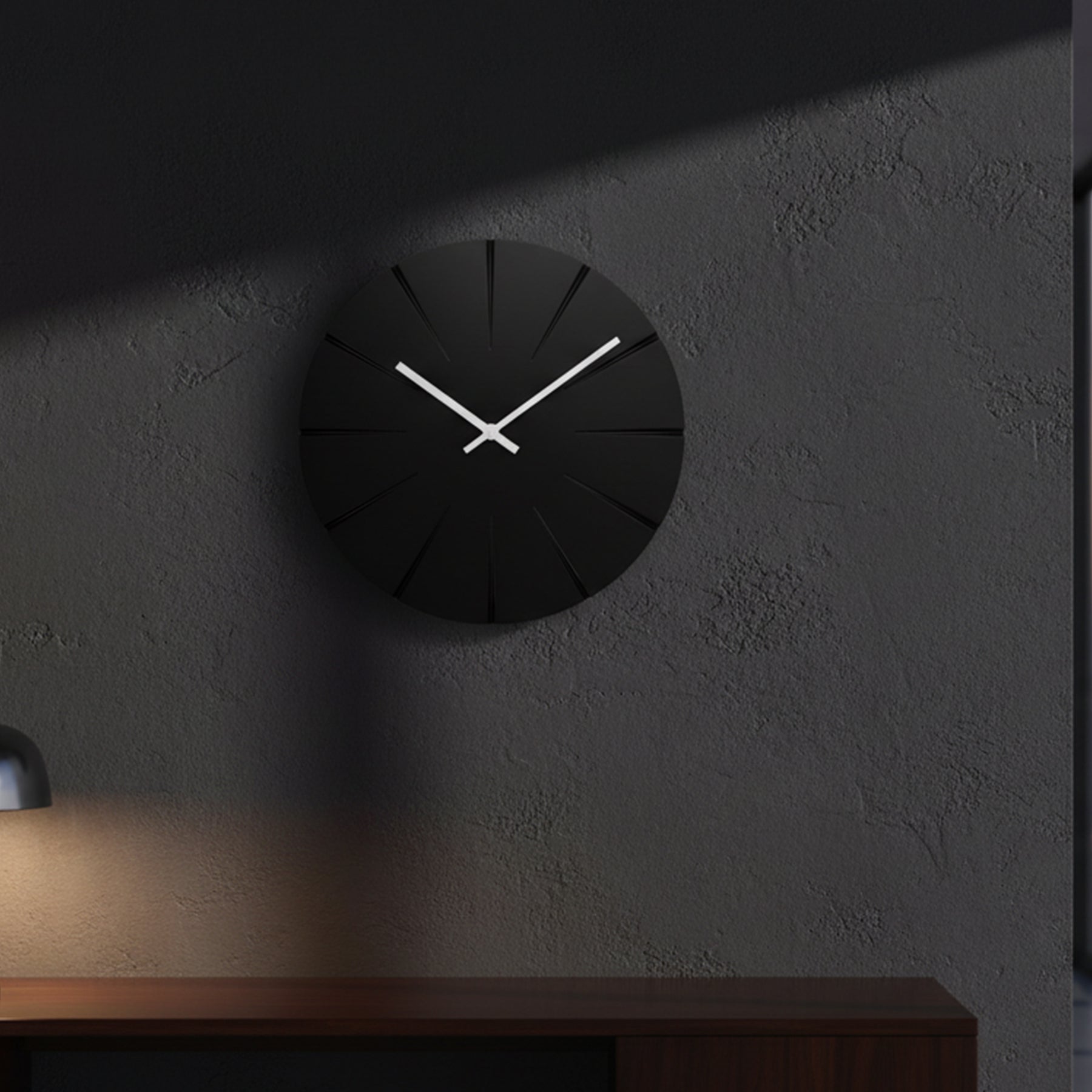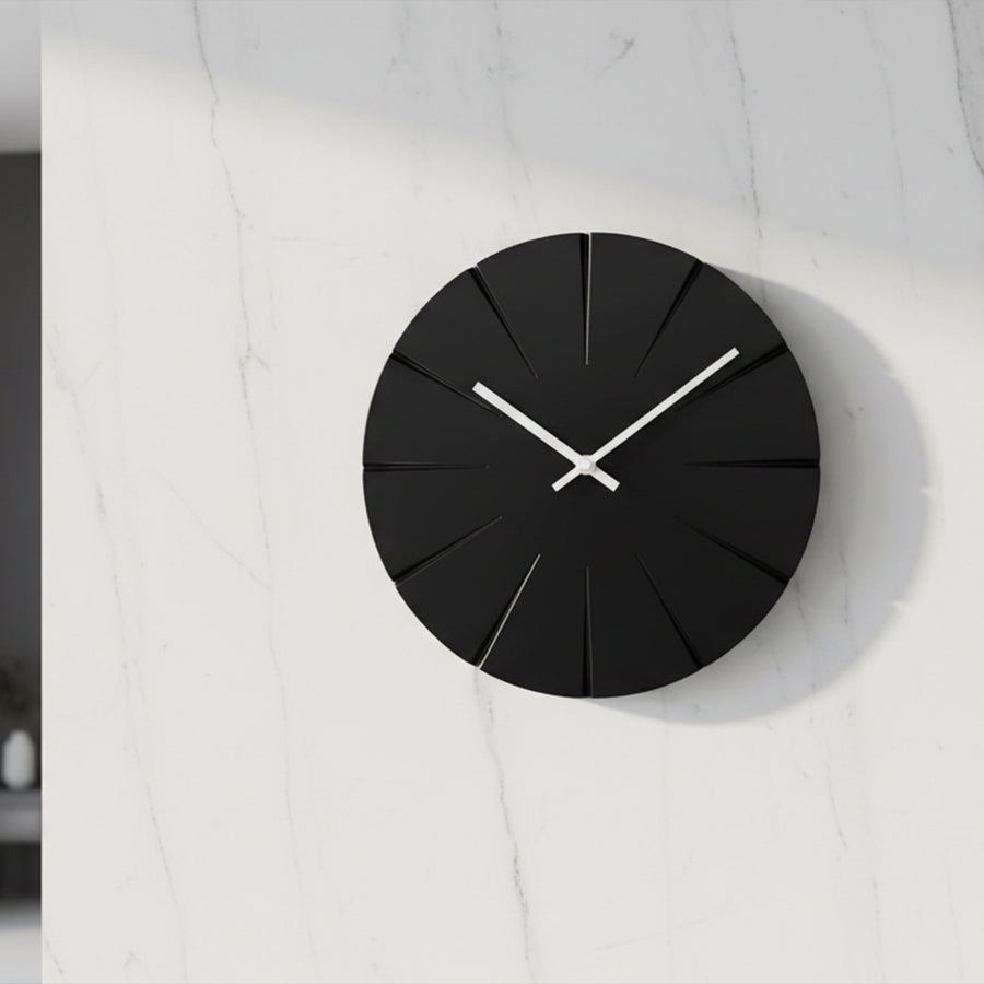 The Rayon Clock transforms the concept of time into a refined play of light and geometry. Its deep matte-black dial is sculpted with subtle radial grooves, creating a quiet sunburst effect that shifts with changing light. Clean white hands cut sharply across the surface, offering striking contrast and effortless readability.