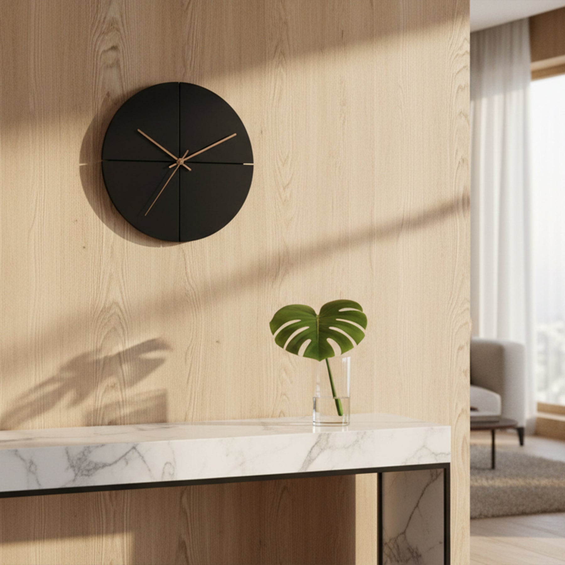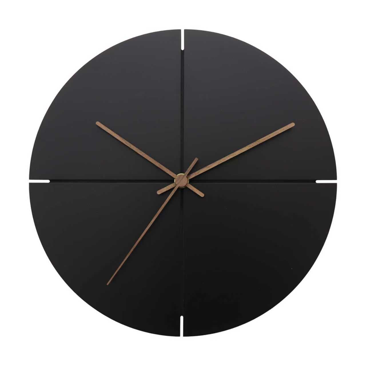 The Vertex Line Clock is a study in balance, contrast, and intentional design. Its deep matte-black face is divided by crisp linear cuts that intersect at the center, creating a bold geometric presence. Subtle white alignment marks break the darkness just enough, while warm wooden hands bring organic contrast—softening the form with natural elegance.